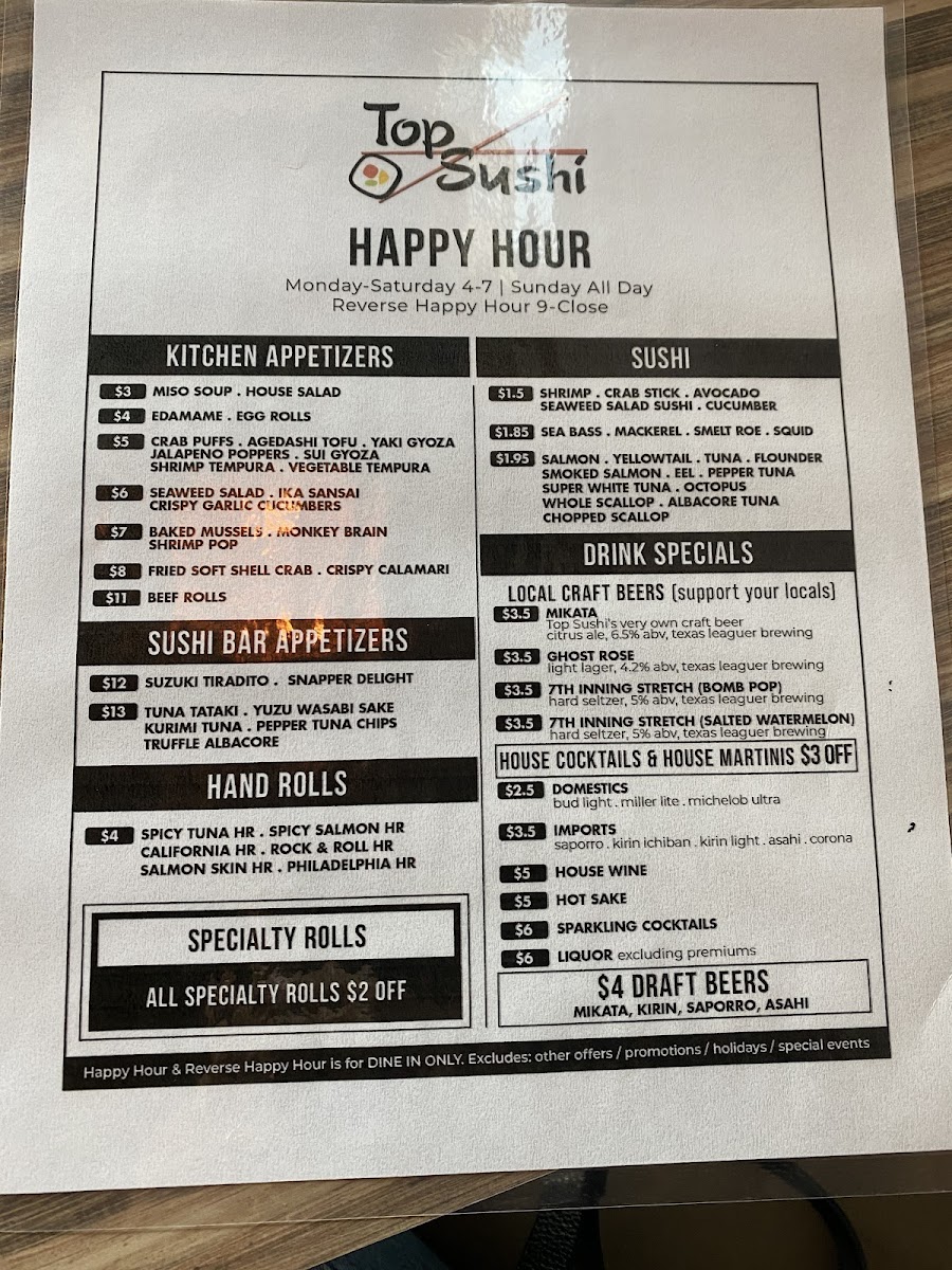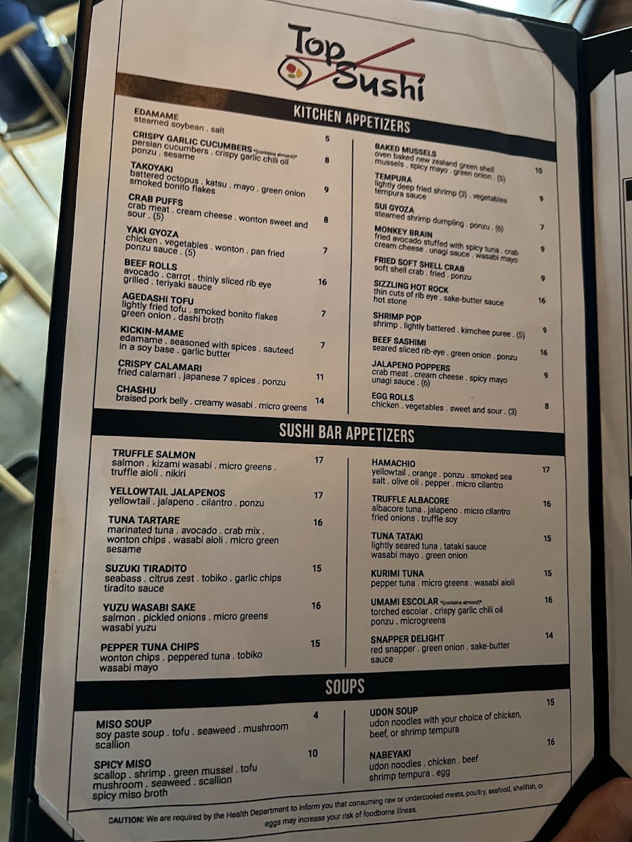 Whether you are a sushi aficionado or a newcomer, Top Sushi is a must-visit, where delicious food meets exemplary service in a clean, inviting setting.